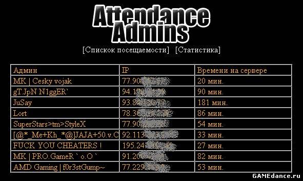 | Форум Дополнения (моды, плагины) Statistical Attendanceadmins (Регистрирует посещаемость админов.) |